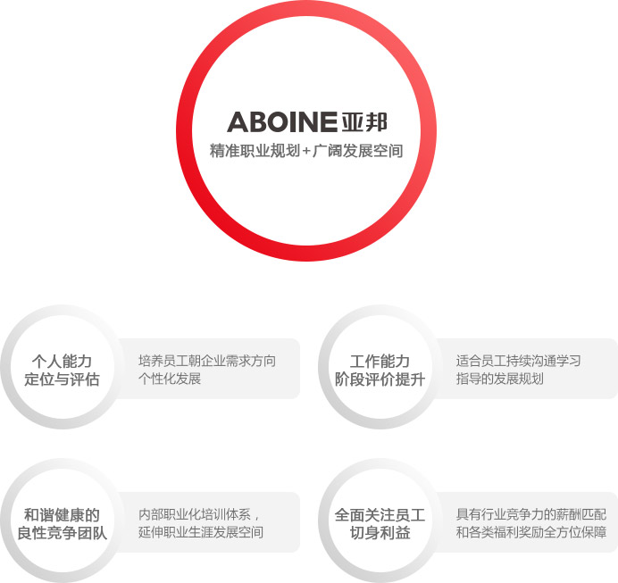 ABOINE亚邦用心专注每一位员工的成长和发展,我们拥有一个适合员工与公司共同发展的健康良好的竞争学习环境,保证每位在亚邦的优秀人才获得一个完善的员工保障和长远的发展机会。
